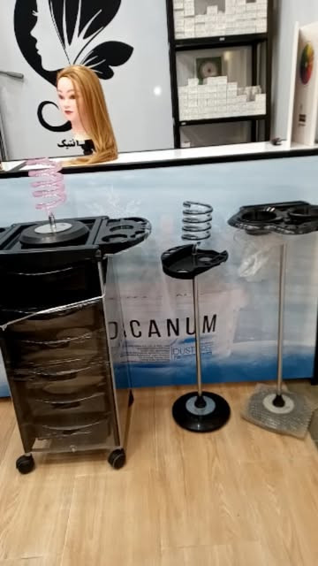 ابزار کار سالنداران شامل ترولی، پایه سشوار ایستاده و رومیزی، پایه رنگ ایستاده و مانکن رومیزی.